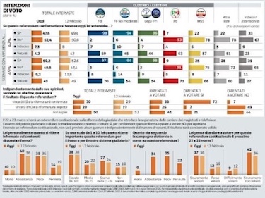 Nell’articolo sul «Corriere della Sera», con il quale presenta il sondaggio sul referendum confermativo del 22-23 marzo, Nando Pagnoncelli, presidente di Ipsos Doxa, docente dell'Università Cattolica del Sacro Cuore di Milano e collaboratore nelle trasmissioni televisive di Giovanni Floris (Ballarò, Di Martedì … ecc.), registra una prevalenza del voto contrario alla riforma della magistratura approvata dal Parlamento a ottobre 2025. Lo scenario descritto dall’autore poggia su una duplice constatazione: da un lato, a favorire il NO sarebbe una partecipazione attestata al 42%, che scaturirebbe da un ridotto interesse degli elettori per il tema; dall’altro, il SI sarebbe penalizzato dalla maggiore mobilitazione delle opposizioni rispetto ai partiti sostenitori della riforma… di Luigi O. Rintallo