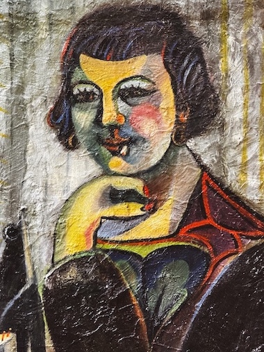 Il talento di Fernande fu elogiato dallo stesso Picasso, che discusse positivamente delle sue capacità artistiche, includendola in una comparazione favorevole con Dora Maar. Il dipinto raffigura una donna fumante, seduta su una sedia circolare e appoggiata a un tavolo. Lo stile richiama l’audacia espressionista delle Avanguardie, con tratti volumetrici semi-geometrici che conferiscono un’armonia avvolgente a tutta la composizione. I lineamenti del volto corrispondono ai ritratti e alle foto di Fernande dell’epoca, inclusi gli autoritratti riportati nelle sue memorie.