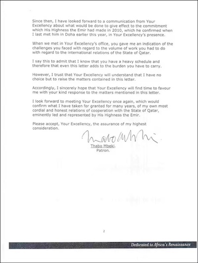Il secondo documento presentato di seguito è una lettera trapelata scritta e firmata da Mbeki, indirizzata al dott. Khalid Bin Muhammad Al-Attiya. La lettera è datata 22 ottobre 2012, appena un mese prima della conferma da parte dell'ambasciatore del Qatar del "trasferimento di 2 milioni di dollari" a Mbeki. Infatti, nella lettera trapelata, Mbeki ha detto all'ex ministro degli Esteri del Qatar: "Come ricorderà Vostra Eccellenza, l'Emiro ha ordinato a Sua Eccellenza di discutere con me la questione dell'attuazione dell'impegno specifico che ha preso nel 2010 per assistere la Fondazione Thabo Mbeki".