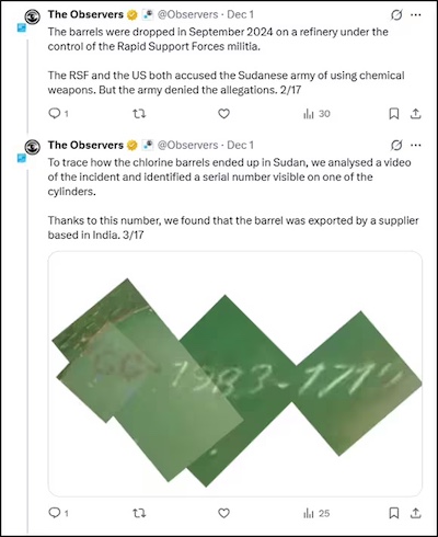 Un'indagine del team di FRANCE 24 Observers rivela come il gas di cloro sia stato usato come arma nella guerra civile in corso in Sudan. Tutte le prove suggeriscono che l'esercito sudanese ha usato il cloro per riconquistare una raffineria strategica dalla milizia delle Forze di supporto rapido. (Vedi: https://x.com/France24_en/status/1997026360212983902, 5 dicembre 2025; Vedi anche il video YouTube di France24)