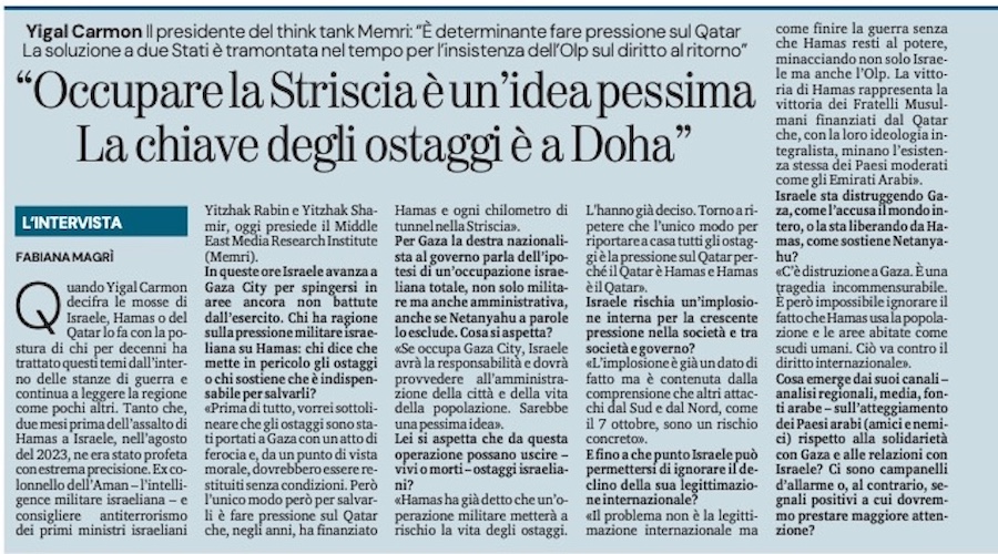 Quando Yigal Carmon decifra le mosse di Israele, Hamas o del Qatar lo fa con la postura di chi per decenni ha trattato questi temi dall’interno delle stanze di guerra e continua a leggere la regione come pochi altri. Ex colonnello dell’Aman – l’intelligence militare israeliana – e consigliere antiterrorismo dei primi ministri israeliani Yitzhak Rabin e Yitzhak Shamir, oggi presiede il Middle East Media Research Institute (Memri).