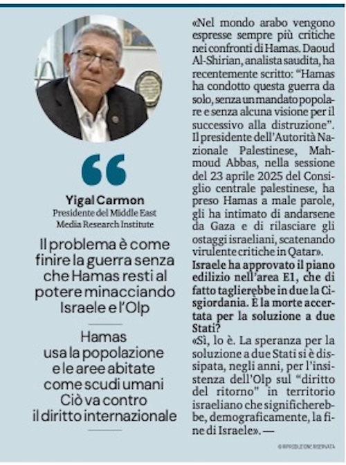 «Nel mondo arabo vengono espresse sempre più critiche nei confronti di Hamas. Daoud Al-Shirian, analista saudita, ha recentemente scritto: “Hamas ha condotto questa guerra da solo, senza un mandato popolare e senza alcuna visione per il successivo alla distruzione”. Il presidente dell’Autorità Nazionale Palestinese, Mahmoud Abbas, nella sessione del 23 aprile 2025 del Consiglio centrale palestinese, ha preso Hamas a male parole, gli ha intimato di andarsene da Gaza e di rilasciare gli ostaggi israeliani, scatenando virulente critiche in Qatar».