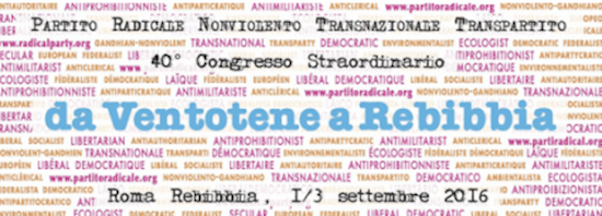 Il 9 luglio scorso, ai sensi dello Statuto del Partito Radicale Nonviolento, Transnazionale e Transpartito, articolo 2, un terzo degli iscritti da almeno sei mesi al partito ha convocato il 40° Congresso straordinario del Partito Radicale Nonviolento Transnazionale e Transpartito, da giovedì 1 settembre (a partire dalle ore 14) a sabato 3 settembre, a Roma, presso il penitenziario di Rebibbia, Via Raffaele Majetti 75, con il seguente ordine del giorno: