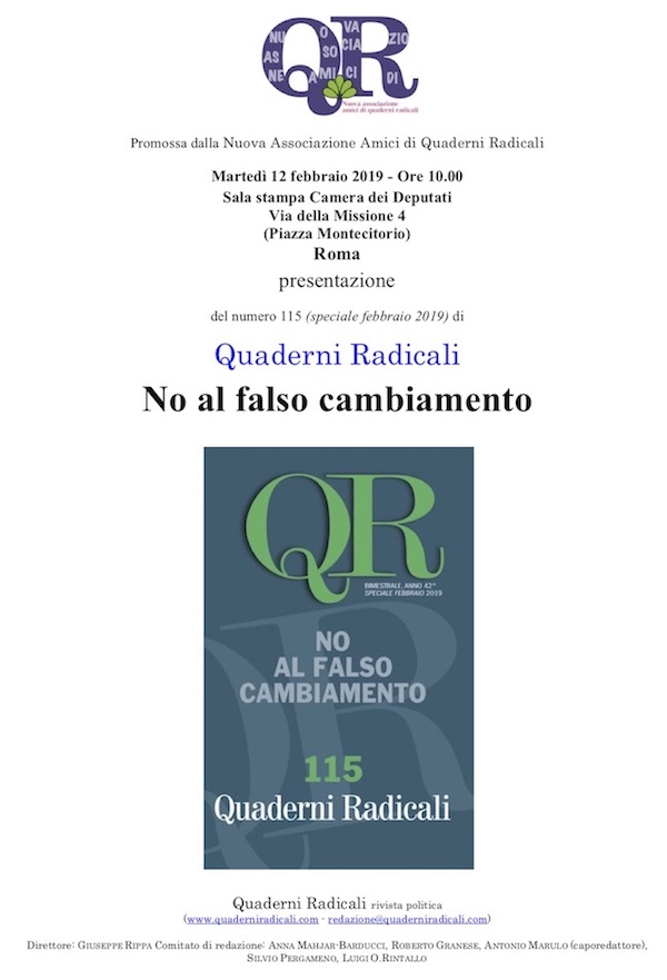 Promossa dalla Nuova Associazione Amici di Quaderni Radicali, martedì 12 febbraio 2019, alle ore 10.00, presso la sala stampa della Camera dei Deputati (Via della Missione 4 - piazza Montecitorio – Roma), presentazione del numero 115 (speciale febbraio 2019) di Quaderni Radicali “No al falso cambiamento” con interventi di: