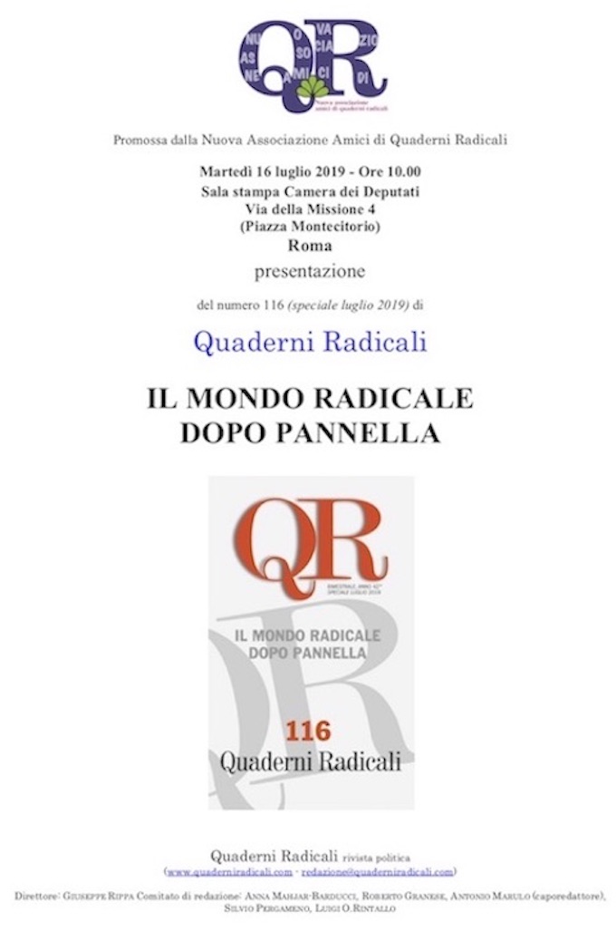 Promossa dalla Nuova Associazione Amici di Quaderni Radicali, martedì 16 luglio 2019 - Ore 10.00 - sala stampa Camera dei Deputati (Via della Missione 4 / Piazza Montecitorio Roma) è stato presentato il numero 116 (speciale luglio 2019) di Quaderni Radicali “IL MONDO RADICALE DOPO PANNELLA”.