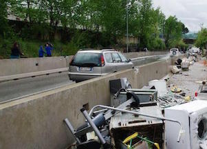 Lei si è quasi spaccata la testa: sbalzata dall'impatto con il taxi, è stata sbattuta violentemente contro il Muro dell'Apartheid. Si tratta di una lunga fila di piloni di cemento, voluta dal “Sindaco dei Diritti Umani” Ignazio Marino e brillantemente realizzata, all'epoca, dal vicecomandante Antonio Di Maggio, che fu imposta attorno al campo di via Salviati per delimitare l'area del ghetto.