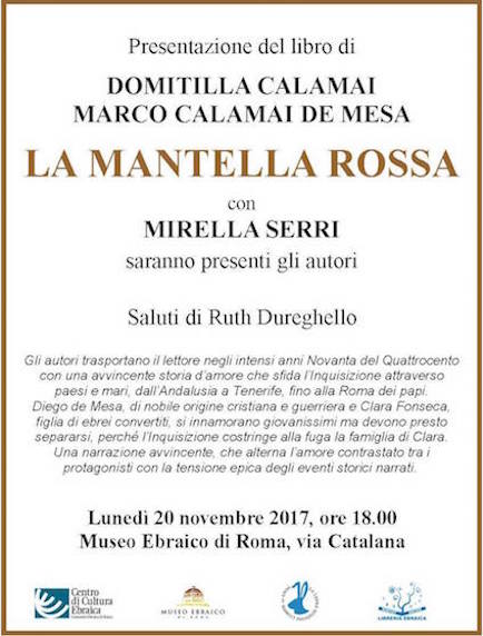 Lunedì 20 novembre 2017, alle ore 18.00 presso il Museo Ebraico di Roma in via Catalana, presentazione del libro di Domitilla Calamai e Marco Calamai De Mesa La Mantella Rossa (La Lepre Edizioni).