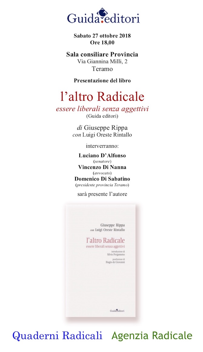 Sabato 27 ottobre 2018 nella Sala consiliare Provincia, Via Giannina Milli, 2 - Teramo, si è tenuta la presentazione del libro “l’altro Radicale - essere liberali senza aggettivi” (Guida editori) di Giuseppe Rippa con Luigi O. Rintallo.