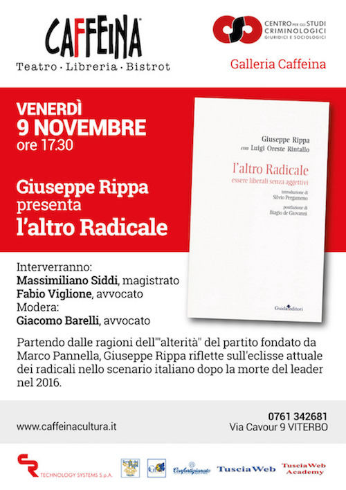 Venerdì 9 novembre 2018 al Teatro Biblioteca CAFFEINA, via Cavour 9 - Viterbo, presentazione del libro “l’altro Radicale - essere liberali senza aggettivi” (Guida editori) di Giuseppe Rippa con Luigi O. Rintallo.