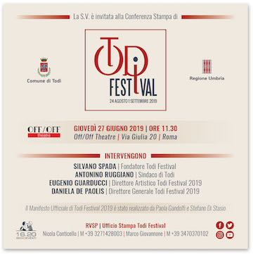 Il 24 agosto inizierò la XXXIII edizione di Todi Festival, kermesse di teatro, musica, danza e arti visive ideata e fondata nel 1987 da Silvano Spada, che proseguirà fino al 1 Settembre 2019.