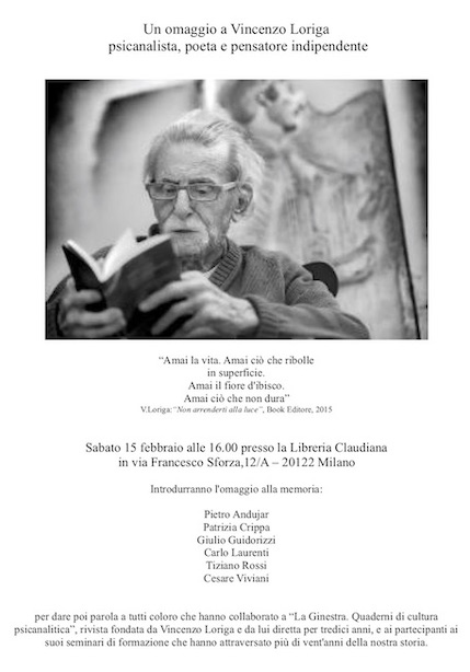 A quasi quattro mesi dalla scomparsa di Vincenzo Loriga, psicoanalista e poeta, dopo il ricordo a Roma, si terrà a Milano, presso la libreria Claudiana, sabato 15 febbraio alle ore 16.00 (via Francesco Sforza, 12/A) un incontro che vuole essere un omaggio a questo pensatore indipendente.