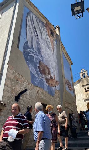 “Remy Uno”, continua parlandomi dello street artist marsigliese “con cui siamo in contatto da quattro anni, ma che non eravamo riusciti a collocare in una determinata tappa. Quest’anno ci è sembrato idoneo per la causa di Mendicino. Lui parte da una base figurativa che viene “glitchata”. Utilizza spesso dei veli, e in questo caso si tratta di un velo di seta. Ha dipinto la facciata della scuola, nel centro storico della città”.