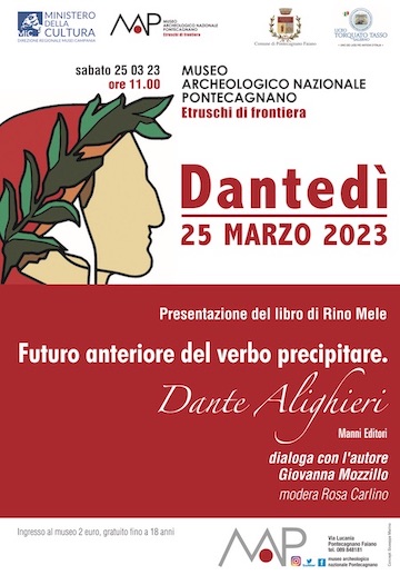 In occasione di Dantedì, sabato 25 marzo 2023 alle ore 11:00, presentazione del libro di Rino Mele Futuro anteriore del verbo precipitare. Dante Alighieri (Edizioni Manni), presso il Museo Archeologico Archeologico Pontecagnano (Etruschi in Frontiera). Dialoga con l’autore Giovanna Mozzillo, modera Rosa Carlino.