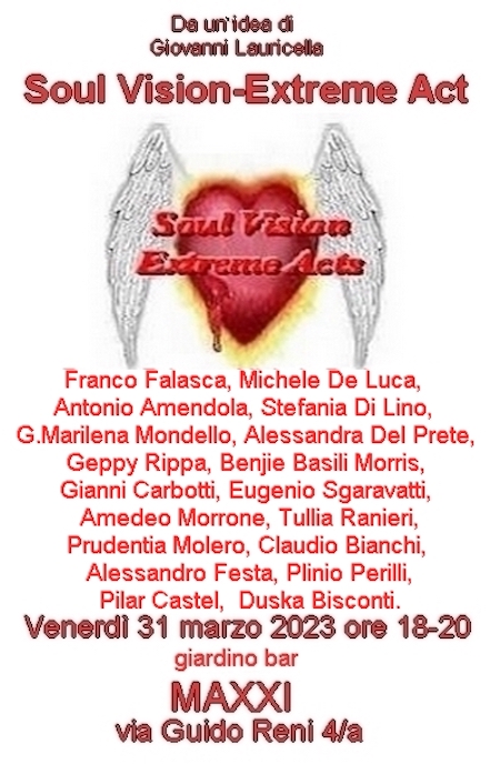 Franco Falasca, Michele De Luca, Antonio Amendola, Stefania Di Lino, Giuseppina Marilena Mondello, Alessandra Del Prete, Geppy Rippa, Benjie Basili Morris, Gianni Carbotti, Eugenio Sgaravatti, Amedeo Morrone, Tullia Ranieri, Prudentia Molero, Claudio Bianchi, Alessandro Festa, Plinio Perilli, Pilar Castel, Duska Bisconti, Giovanni Lauricella interpreteranno Soul Vision-Extreme Act. Consumazione obbligatoria.