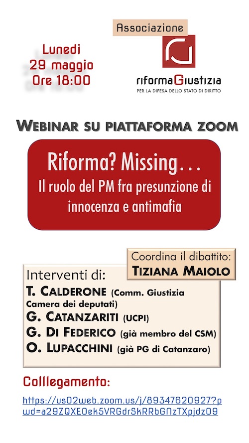 Promosso dalla Associazione “riformaGiustizia”, lunedì 29 maggio ore 18:00 Webinar su piattaforma ZOOM sul tema "Riforma?Missing….. Il ruolo del PM fra presunzione di innocenza e antimafia".