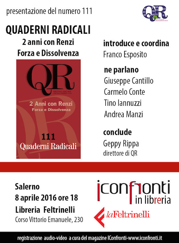 Venerdì 8 aprile, alle ore 18.00, presso la libreria Feltrinelli di Salerno (Corso Vittorio Emanuele, 230) presentazione del n. 111 di Quaderni Radicali (2 anni con Renzi. Forza e dissolvenza). Interverranno Giuseppe Cantillo, Carmelo Conte, Tino Iannuzzi, Andrea Manzi. Introduce e coordina Franco Esposito. Conclude Giuseppe Rippa, direttore di Quaderni Radicali