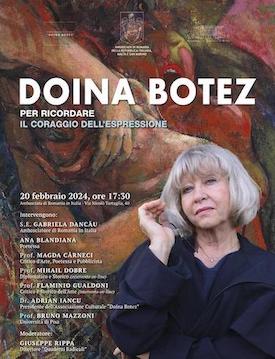 Lo scorso martedì 20 febbraio 2024, ore 17:30, si è celebrato a Roma nell'Ambasciata di Romania il dovuto tributo a una grande artista: “Doina Botez.Per ricordare. Il coraggio dell’espressione”, evento dedicato alla famosa pittrice ma anche illustratrice, purtroppo scomparsa da circa un anno, persona che ha lasciato un vuoto che si notava palpabile nel volto dei presenti nella grande sala messa a disposizione per l’occasione… Giovanni Lauricella