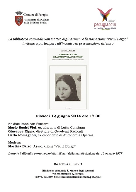 In collaborazione con l'associazione "Vivi il Borgo" di Perugia e la Biblioteca comunale San Matteo degli Armeni, giovedì 12 giugno ore 17,30 presso la Biblioteca di san Matteo degli Armeni, via Monteripido 2 a Perugia presentazione dell'instant book di Andrea Maori "Giorgiana Masi e la primavera di piombo. Cronache inedite sugli incidenti del mese di maggio 1977".
