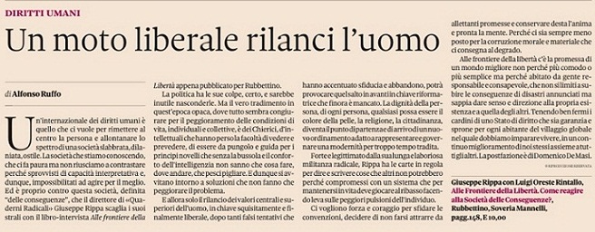 Un’internazionale dei diritti umani è quello che ci vuole per rimettere al centro la persona e allontanare lo spettro di una società slabbrata, dilaniata, ostile. La società che stiamo conoscendo, che ci fa paura ma non riusciamo a contrastare perché sprovvisti di capacità interpretativa e, dunque, impossibilitati ad agire per il meglio. Ed è proprio contro questa società, definita "delle conseguenze", che il direttore di «Quaderni Radicali» Giuseppe Rippa scaglia i suoi strali con il libro-intervista Alle frontiere della Libertà appena pubblicato per Rubbettino.