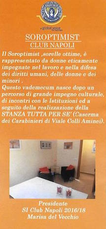 Qual è l'iter più idoneo da seguire per una donna che voglia difendersi e trovare un valido supporto? Ѐ stato distribuito ai presenti un’utile brochure, una sorta di vademecum sui punti salienti di tale iter. Il Soroptimist, inoltre, si è battuto per la realizzazione della "stanza tutta per sé", (presso la Caserma dei Carabinieri di Colli Aminei), in cui le donne soggette a violenze sono accolte e ascoltate con sensibilità e umanità da personale specializzato che cercherà di metterle a proprio agio, vincendo paure e resistenze di ogni genere.