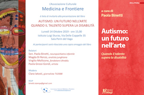 Il 14 ottobre 2019, alle ore 15.00, presso l’Istituto Luigi Sturzo, in Via Delle Coppelle a Roma, sarà presentato il libro “Autismo: un futuro nell’arte - Quando il talento supera la disabilità” (Ed. Magi) di Paola Binetti e, presidente del comitato scientifico dell’Associazione culturale “Medicina e Frontiere”, nata da un’idea del professor Michele Guarino. Ne parleranno, con Paola Binetti, Magda Di Renzo, analista junghiana Virgilio Mollicone, fondatore di Ultrablu e l’artista Paola Grossi Gondi. Coordinatrice del dibattito sarà la giornalista Clara Iatosti.