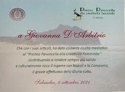 A Giovanna D'Arbitrio la Giuria del Premio Pavoncella ha voluto offrire un targa