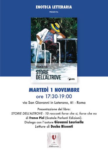 All’Enoteca Letteraria (via San Giovanni in Laterano, 81 Roma) martedì 1 novembre alle 17.30, Franco Piol dialoga con Giovanni Lauricella sul suo libro “Storie dell’altrove” (Scatole Parlanti Edizioni), con letture di Duska Bisconti.