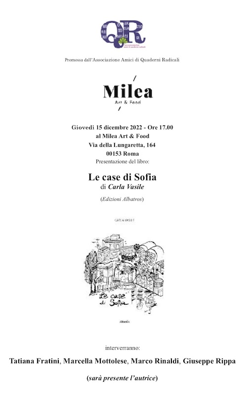 Giovedì 15 dicembre 2022 - ore 17.00 al Milea Art & Food (Via della Lungaretta, 164 - 00153 Roma presentazione del libro: Le case di Sofia di Carla Vasile (Edizioni Albatros)