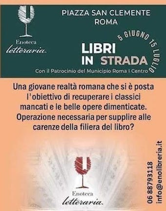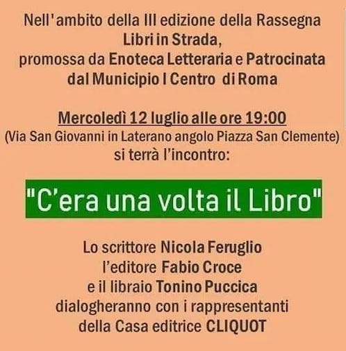 Il prossimo appuntamento sarà tra pochi giorni nell'ambito della III edizione della rassegna Libri in Strada, promossa da Enoteca Letteraria e Patrocinata dal Municipio I Centro di Roma, mercoledì 12 luglio alle ore 19:00 - (Via San Giovanni in Laterano angolo Piazza San Clemente) dove si terrà l’incontro: "C’era una volta il Libro" con lo scrittore Nicola Feruglio, l'editore Fabio Croce, il Libraio Tonino Puccica e i rappresentanti della Casa editrice CLIQUOT, una giovane realtà romana che si è posta l'obiettivo di recuperare i classici mancati e le belle opere dimenticate.