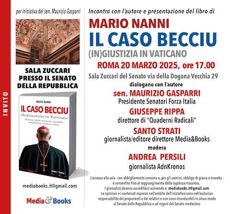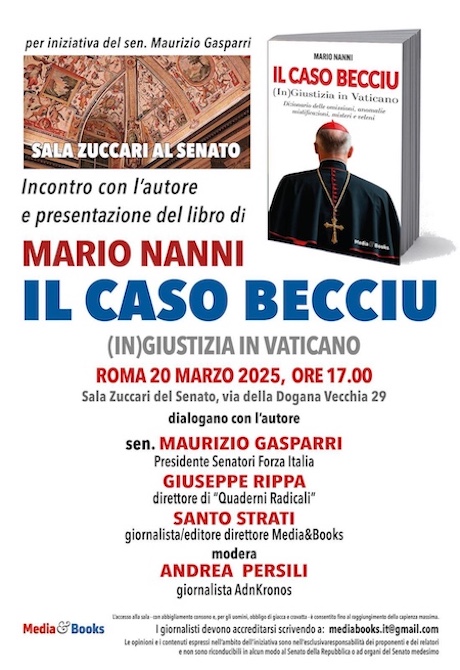 Presso la Sala Zuccari del Senato della Repubblica, in via della Dogana Vecchia ab Roma, giovedì 20 marzo 2025, vi è stato l'incontro con l’autore e presentazione del libro IL CASO BECCIU (In)Giustizia in Vaticano di Mario Nanni. Hanno dialogoto con l’autore: Maurizio Gasparri (presidente senatori Forza Italia), Giuseppe Rippa (direttore di Quaderni Radicali e Agenzia Radicale), Santo Strati (giornalista/editore direttore Media&Books). Modera: Andrea Persili (giornalista AdnKronos).
