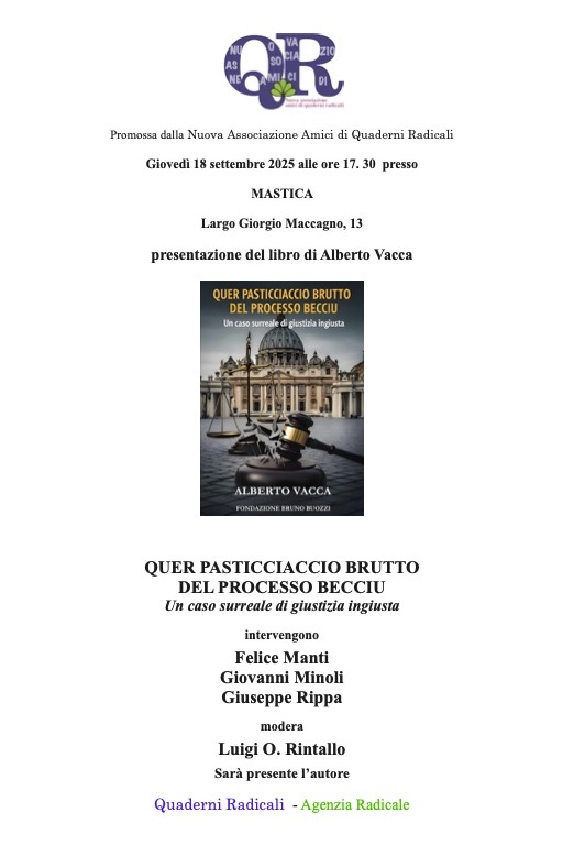 Promossa dalla Nuova Associazione Amici di Quaderni Radicali Giovedì 18 settembre 2025 alle ore 17.30 presso MASTICA (Largo Giorgio Maccagno, 13) presentazione del libro di Alberto Vacca “QUER PASTICCIACCIO BRUTTO DEL PROCESSO BECCIU Un caso surreale di giustizia ingiusta".