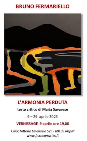 Vernissage mercoledì 9 aprile la mostra di Bruno Fermariello dal titolo “L’armonia Perduta” presso la galleria FrameArsArtes di Napoli, a cura di Paola Pozzi e Brunello Nardone, con testo critico di Maria Savarese. La mostra proseguirà fino al 25 aprile.