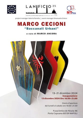 Il Lanificio25 ospita il ritorno a Napoli dell'Artista italo-svedese Marco Cecioni. Napoletano di nascita ma residente da anni a Stoccolma, espone una selezione di opere di pittura, grafica, ceramiche e design dal titolo "Baccanali Urbani”…