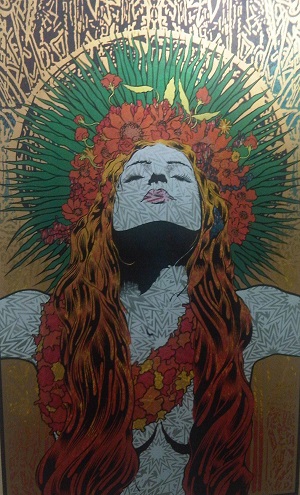 Mi è venuto in mente tutto questo entrando nella galleria Mondo Bizzarro in via Sicilia a Roma, dove il poster dedicato da Chuck Sperry alla propria mostra “I fiori delle vittorie popolari” che ivi si svolge è appunto Widespread panic, una immagine di donna nuda con una corona e una collana di fiori, dai lunghi capelli biondi che morbidamente si sciolgono sul corpo coprendone i seni.