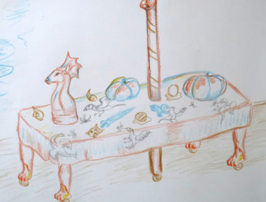 Si leva, all'estremità del tavolo opposta alla trave, la testa di un cavallo. Ha, accanto agli orecchi, anche due corna e, in cima alle corna, ha due piccoli gonfi tacchini. Sul suo collo e anche qua e là sul tavolo vi sono conchiglie colorate.