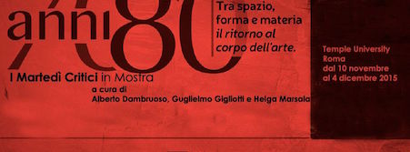 Mentre a Bologna celebrano i quaranta anni della kermesse di Arte Fiera dove affluiscono operatori ed artisti da tutto il mondo, a Roma al Temple University con una mostra “Anni ‘80 / ’90 “, ciclo espositivo iniziato l’anno scorso, si celebrano i cinque anni dei Martedì critici dell’eroico Alberto Dambruoso che con i suoi partner ci ha fatto conoscere dal vivo il meglio che si poteva della scena artistica contemporanea che questa volta ha dato la ribalta a Giovanni Albanese, Mario Airò, Stefano Arienti, Andre Aquilanti, Massimo Bartolini, Paolo Canevari, Marco Cigolani, Gregorio Botta, Andre Fogli, Liliana Moro, Cesare Pietroiusti, Massimo Uberti, Vedovamazzei, Luca Vitone; correlati da un breve ma efficace testo di Helga Marsala.