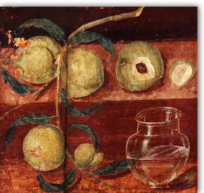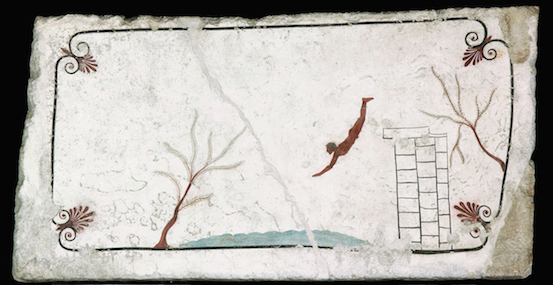 Molto suggestiva, emozionante addirittura, è la lastra proveniente dall'antica città greca di Poseidonia, la patria di Parmenide. La lastra, detta “del Tuffatore”, rappresenta colui che si tuffa nel mare, dipinto come una superficie curva e increspata, simbolo del mondo dell'aldilà. Mi fa pensare alla sofia parmenidea. E anche a un sarcofago che si trova, in fila insieme ad altri, al MANN, che rappresenta la morte in un modo sintetico: al centro di una superficie ondulata scolpita su un lato, vi è una porta. La porta è leggermente socchiusa, forse è stata spinta da un soffio (=anemos): ha un'apertura sottile, vi può passare soltanto un'anima. E mi fa pensare alla concezione dei napoletani, più volte da tanti osservata, di una sorta di promiscuità dei vivi con i morti. Invito a notare, in una “natura morta con frutta”, la volumetricità dei pomi e il fatto che essi si trovino realisticamente appoggiati su delle mensole, che sono rappresentate da differenti punti di vista.