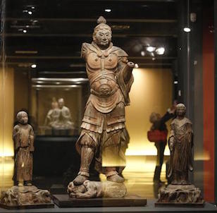 Statue prevalentemente lignee ricompongono la storia giapponese dalla fine del 700 al 1300, quindi coprendo il tardo periodo Heian e la successiva epoca Kamakura: un periodo imparagonabile con il nostro Medio Evo in quanto per il Giappone il periodo Heian somiglia piuttosto all’età classica con la nascita dello stato attorno alla capitale imperiale Kioto, sede di una raffinata civiltà letteraria, mentre l’epoca Kamakura vide il trionfo degli ideali samuraici e del buddhismo zen, in un contesto storico e culturale assai differente.