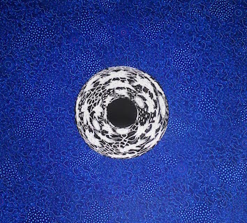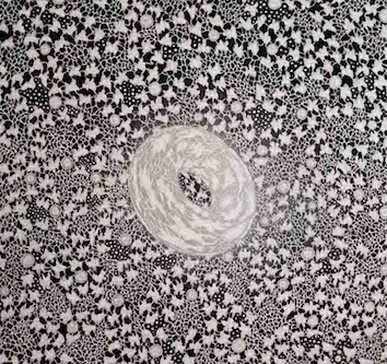 Nella splendida cornice del Palazzo S. Chiara sono presenti nove opere di vario formato che narrano prevalentemente una forma molto semplice, circolare, che nella mostra si afferma ossessivamente con la sua costante presenza, come se fosse oggetto di una indagine sulla spazialità del cosmo, che l’artista Giorgio Milano ridefinisce con un ricamo floreale che ne scompone la compattezza.