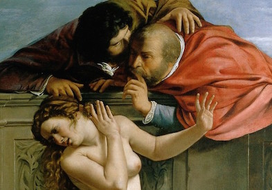 Susanna con i vecchioni dipinto a diciassette anni oltre a rivelare le sue precoci doti artistiche (diciassette anni) mette in evidenza l’anomalo desiderio verso la donna, quadro che ripeterà pochi anni prima di morire in uno schema figurativo dove la morbosità maschile è più esplicita. Giuditta che decapita Olofene (1612-1613) è un po’ l’icona “manifesto” delle femministe; vi è esplicito il riferimento all’ esecrazione dello stupro subito. Qui la teatralità caravaggesca viene superata con una abbondante rappresentazione del sangue che spilla, sotto una luce gelida ed impietosa, quasi ad anticipare le rappresentazioni cinematografiche di Quentin Tarantino, noto regista americano di film splatter.