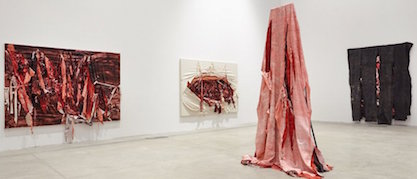 È proprio quello che ti viene in mente andando al Macro alla vista delle opere di Anish Kapoor, una artistar che per l’ennesima volta tenta di nuovo di sorprendere il pubblico con effetti speciali, questa volta respingenti per la sgradevolezza della sensazione creata dal silicone appositamente modellato a fingere carni rosse appese al muro, con macchie che alludono a schizzi di sangue che producono una angosciante sinistra sorpresa.