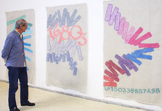 Quello che più mi intriga di Giorgio Griffa è la sua scelta radicale (dalle colonne di questo giornale sembra un gioco di parole) nel fatto che dipinge con colori ad acqua su tessuti grezzi tipo iuta lino o canapa, senza intelaiatura. In pratica ti trovi stoffe colorate appese al muro con dei piccoli chiodini come degli arazzi, poveri o minimalisti come le correnti a cui egli fa riferimento. “Quadri” che quando non sono esposti sono ripiegati e impilati, perché anche il segno della piega svolge una funzione di grigliato esplicativa del contenuto, in quanto facente parte della composizione artistica. Infatti per Giorgio Griffa ogni elemento che compone l’opera è soggetto parlante che, se presente, deve avere una sua giustificazione.