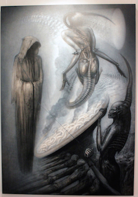 Ci sembra allora superfluo, quasi retorico, parlando del grande pittore, scultore, designer e scenografo svizzero scomparso nel 2014 a seguito d’una banale caduta dalle scale, ridurre l’impatto del suo lavoro sull’immaginario contemporaneo alla famosa collaborazione con Ridley Scott per la saga cinematografica di “Alien”, che pure gli valse il premio Oscar e royalties tali da consentirgli la libertà di rinchiudersi in contemplazione nel mondo onirico e oscuro da cui traeva materiale per le sue creazioni: in realtà si può dire che Giger, definito dall’amico Salvador Dalì “il più grande surrealista vivente” (dopo sé stesso ovviamente!) abbia contribuito come pochi a definire l’estetica del presente, plasmando configurazioni mitiche che continuano a distendere la propria silhouette ineffabile non solo nell’ambito ristretto dell’arte contemporanea (che nel suo snobismo intrinseco, nella sua mancanza di visione prospettica l’ha piuttosto relegato in una dimensione minore - dell’eccentrico o del bizzarro, per quanto d’autore, e del tutto insufficiente a definirne la poetica) ma nei settori più diversi della cultura e delle forme espressive dei tempi che viviamo oltre lo stesso cinema: dalla musica rock - indimenticabili le copertine realizzate per album di musicisti come Emerson, Lake & Palmer, Debbie Harry, Dead Kennedys - alla moda provocatoria di stilisti come Alexander McQueen, dalla letteratura più radicale erede della sperimentazioni della Beat Generation e culminata nell’urlo di rivolta Cyberpunk alle teorizzazioni filosofiche del Postumanesimo.