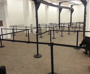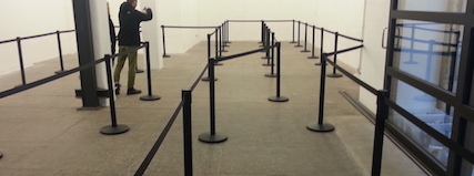 Con un corrimano nero, costituito da quel nastro che si sospende a dei paletti neri piazzati a regolare distanza, che troviamo nei luoghi dove c’è molta fila, gli stanchions, si trasforma l’ampia sala della galleria T293 degli ex napoletani Paola Guadagnino e Marco Altavilla in un labirintico percorso simile a quello del check-in degli aeroporti.