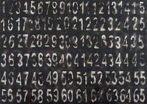 Riflessi è il titolo dato in comune a questa doppia personale, che forse è più pertinente alle opere di Adele Lotito per quella della luce naturale. Infatti l’artista espone dei supporti di metallo lucido che rispecchiano lo spettatore, mentre in un lato dello stesso si notano stampati svariati numeri in un colore ruggine molto scuro che sembrano a rilievo.