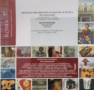 La Scuola d'Arte e dei Mestieri “Arti Ornamentali” di via San Giacomo numero 11 a Roma conclude i corsi con la tradizionale Mostra di fine anno degli allievi. L’inaugurazione il 19 giugno 2017 alle ore 17,00. La Mostra rimarrà aperta fino al 23 giugno, con orari previsti dalle ore 17,00 alle 19,00.