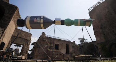 Penserete che mi sono dilungato in argomenti estranei alla mostra, ma se poi nessuno va a vederla, eccetto i turisti che vanno a contemplare l’antico e non il contemporaneo che già hanno nei loro Paesi, è perché è irraggiungibile alle automobili, i mezzi di trasporto non arrivano all’ingresso di via San Gregorio e l’orario di visita è di quelli proibitivi che sono sbandierati come diritti acquisiti dei lavoratori. Per chi ha buona volontà e desiderio di farsi una buona camminata avrà da vedere gigantesche opere degli artisti contemporanei più in auge reinventate in un allestimento che è dato dagli spazi archeologici nudi e crudi quali sono, una mostra che è una arbitraria interpretazione dei ruderi dell’antichità e della concezione contemporanea a gusto del curatore. Un museo Montemartini al contrario che è la prosecuzione dello spaesamento che già hai prima dell’ingresso attraversando quelle strutture e quei cartelloni di cantiere edile che prima avevo menzionato.