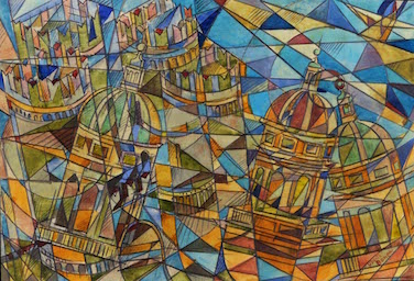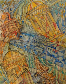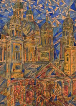 Bonetti ritraeva la città dall’alto e metteva in primo piano i monumenti più significativi. Questi, venivano prima ripetuti come un’immagine contorta e frazionata dal vortice dell’elica, poi scomposti in piccoli segmenti come fossero frammenti d’immagini fotografiche in veloce sequenza, tagliati dall’elica del’aeroplano e poi ricomposti .