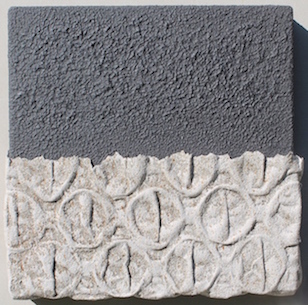 Questi lucidi pannelli fronteggiano, sulla parete opposta e gli si oppongono in contraddittorio, quelli di Alfredo Celli, che invece assorbono luce e non la rimandano. Elegantissimi, hanno delicate sfumature di grigio e, con cavità e sporgenze circolari, sembrano mimare i giochi diversi della pietra. Ma sono realizzati, con un'arte attenta ed esperta, in semplice cartapesta, Un'arte antica che ci porta a citare che a Napoli si trovano, fatte di cartapesta, ma sembrano di marmo, anche antiche sculture sacre di grandi artisti.