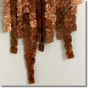 C'è quella di Carmen Novaco. Arte freschissima, modernissima e antica sono quei suoi pannelli di lucido metallo che hanno vari, intriganti disegni geometrici. “Sono brani di tappezzeria di aerei” – mi rivela Lucia Mignolo – “ I vecchi objéts trouvés nella modernità più tecnologizzata”- osservo.